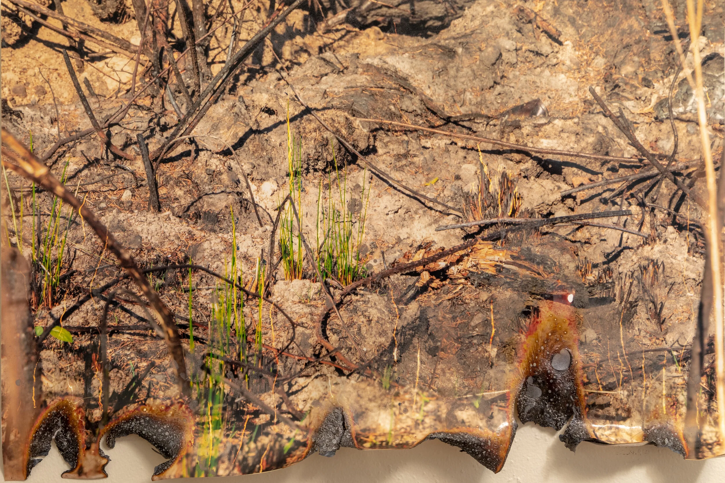 Printed as chromogenic prints and soaked in homemade lye made with wood ash collected from the wildfire sites, these images of past and current wildfire reveal a fiery layer as the ashy alkaline mixture degrades the pigments. The prints become malleable and prone to disruption; included with the uncontrolled disturbances made by the lye are moments of deliberate mark-making created by fingerprints, scratches, and the palm of a hand as a therapeutic method of working through trauma and illness caused by the fires.